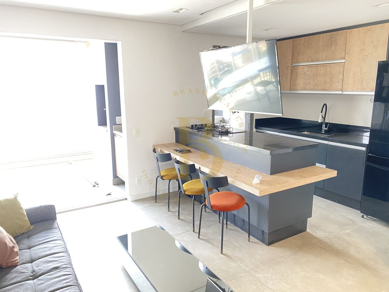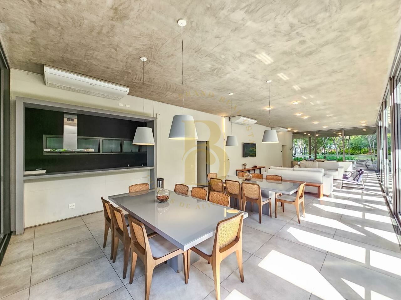 ar condicionado, cozinha ampla, com geladeira embutida, microondas, máquina de lavar louça, ilha de granito, fogão, adega, mesa de jantar, área de serviço com máquina lava e seca, varanda gourmet, 2 vaga de garagem, 2 banheiros e depósito no subsolo.