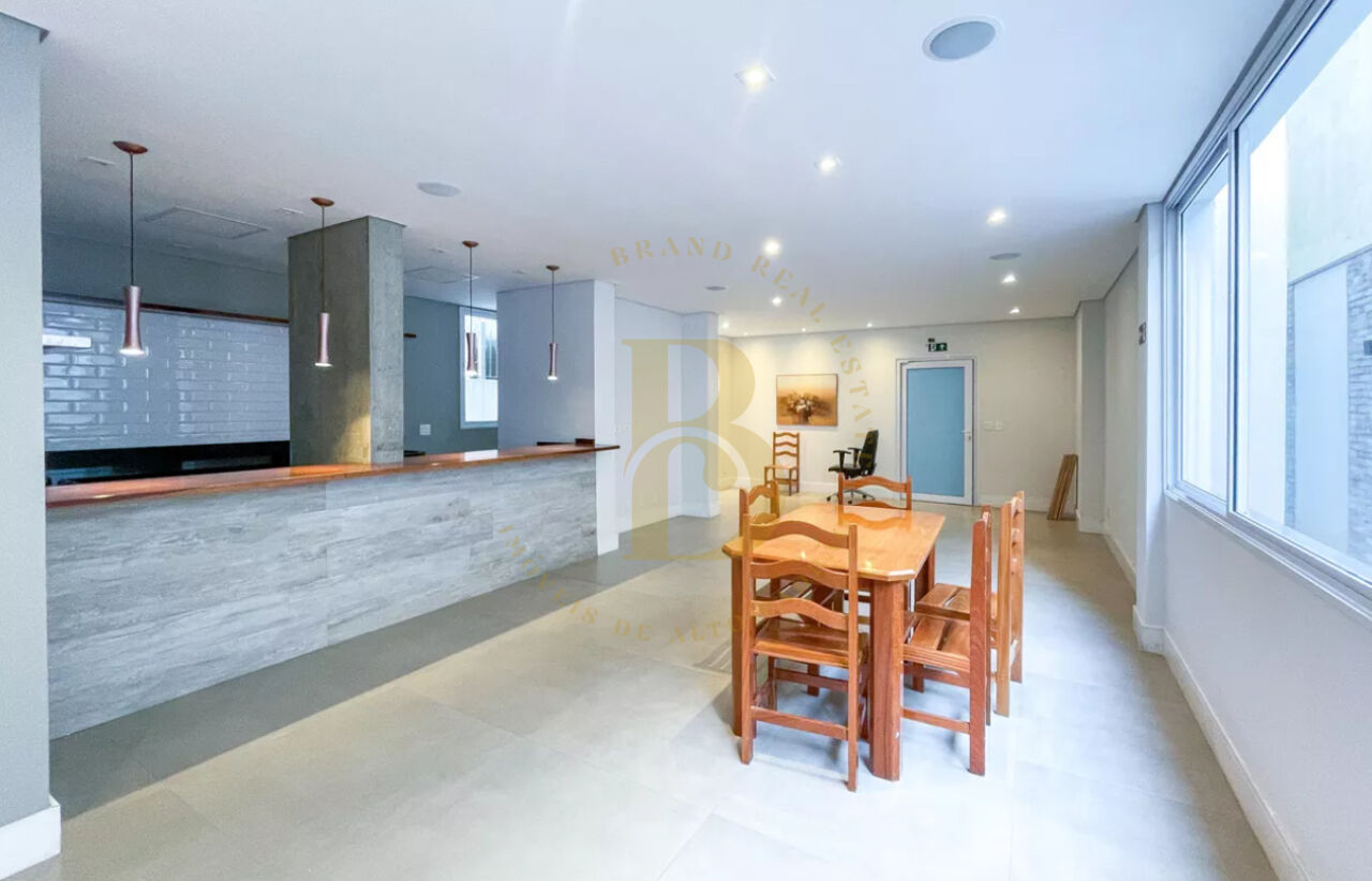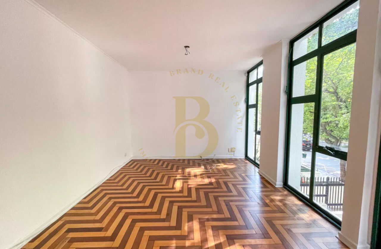 O imóvel se destaca pelo living com piso em tacos e amplo janelão com vidro do piso ao teto, que cria um grafismo elegante e valoriza a luminosidade natural, trazendo charme e personalidade ao ambiente.