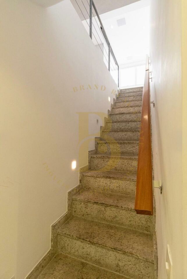 Na parte superior, sala de tv, escritório e mais um quarto para hóspedes. A área externa possui espaço gourmet, solarium e piscina.