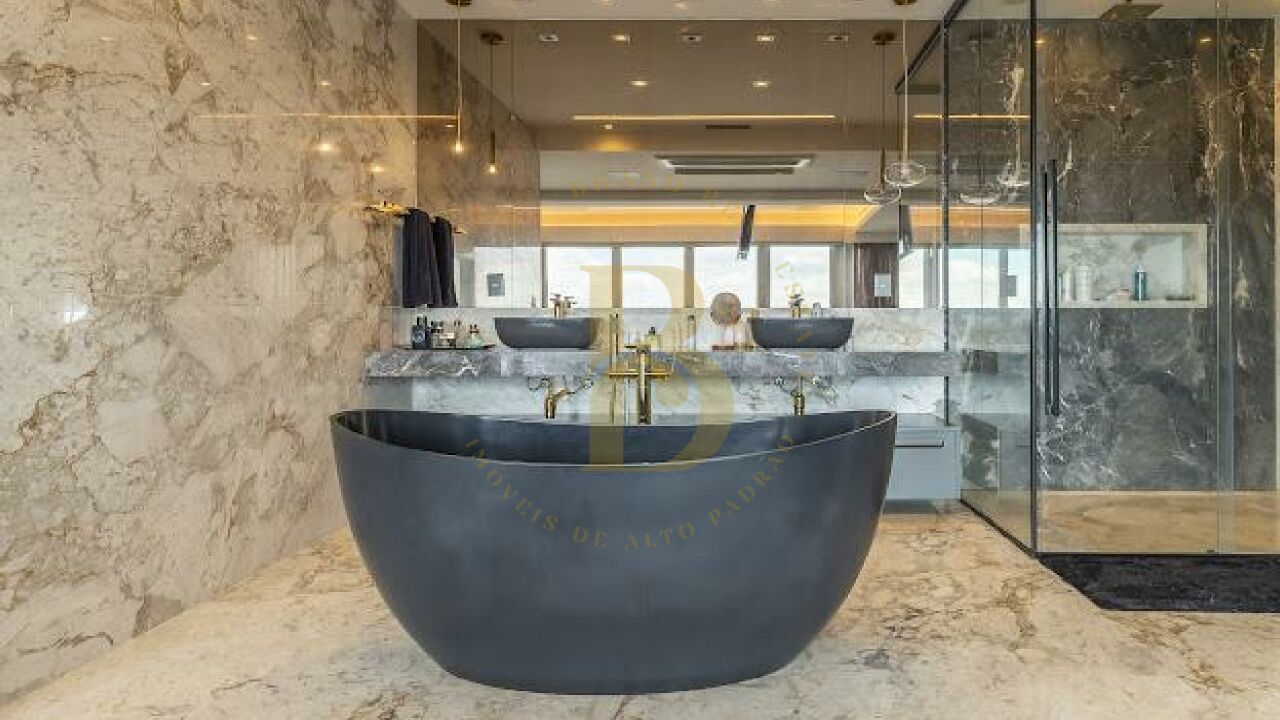 Suíte Master Premium: O refúgio perfeito com vista panorâmica, closet privativo, home office integrado e uma sala de banho luxuosa com banheira, pias e chuveiros duplos.